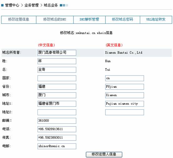 修改相关信息后,点击每个表格下相关修改按钮即可。用户可随时修改注册信息,包括所有者联系信息,管理者、技术联系人等信息。(注:域名所有者和姓名不能修改,如有更改,需按域名过户手续来办理)