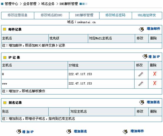 :点击“增加IP”等链接即可进入相关管理界面,进行解析记录管理。解析记录管理包括“增加IP”、“增加别名”及“增加邮件”三项管理功能。