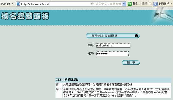 *域名密码为登录域名独立控制面板(domain.it5.cn或者218.5.77.15)时身份验证所需;