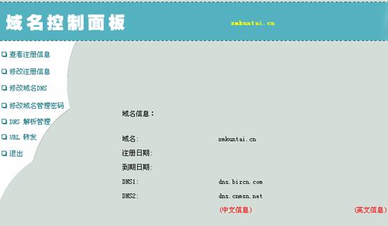 2、 登录域名控制面板,页面将显示域名注册信息及功能菜单,名独立控制面板所具备的功能与管理中心域名DNS管理相同。点击每一个功能菜单,可进入相应的操作界面,操作方式也同管理中心域名DNS管理,也可以在此修改域名的管理密码。